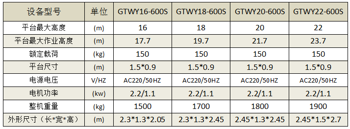 標(biāo)準(zhǔn)配置:平臺(tái)最大高度規(guī)格:可選 16m、18m、20m、22m